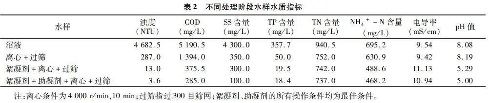 为了验证最佳条件下的絮凝效果,以最佳的絮凝条件进行试验,表2列出了每个步骤的出水水质指标,沼液原样的浊度、COD、SS含量、TP含量、TN含量、NH4+-N含量分别为4682.5NTU、5190.5mg/L、4300.0mg/L、357.7mg/L、940.5mg/L、695.2mg/L,离心过筛处理后的样品浊度、COD、SS含量和TP含量大幅度下降,分别为287.0NTU、1394.0mg/L、350.0mg/L和50.0mg/L,表明离心和过筛可以去除大量的固形物,浊度、COD、SS去除率分别达到93.87%、73.14%、91.86%,TP的去除率达到86.02%,表明固形物中磷含量较多,TN、NH4+-N含量下降不明显,处理后其值分别为752.0、630.9mg/L,可能原因是氮大多以小分子溶解状态存在,不易发生絮凝。